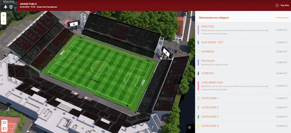 Il n'y a déjà plus de place pour le match retour des barrages entre l'ASSE et le FC Metz. Toutes les places ont été vendues pour le dimanche 2 juin à 17h30 à Saint-Symphorien. Le club de Ligue 1 avait ouvert sa billetterie au grand public vendredi dernier, alors qu'il ne connaissait pas encore son adversaire.