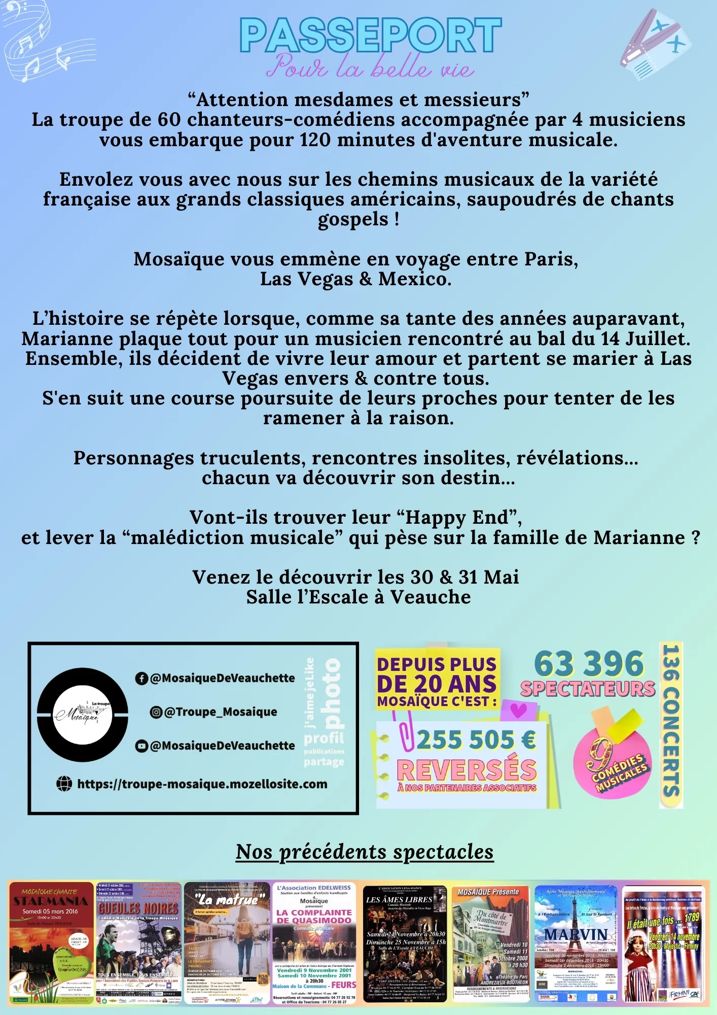 L'association Mosaique vous présente sa 9ème comédie musicale : "Passeport pour la belle vie", les vendredi 30 et samedi 31 mai 2025, à la salle L'Escale de Veauche.