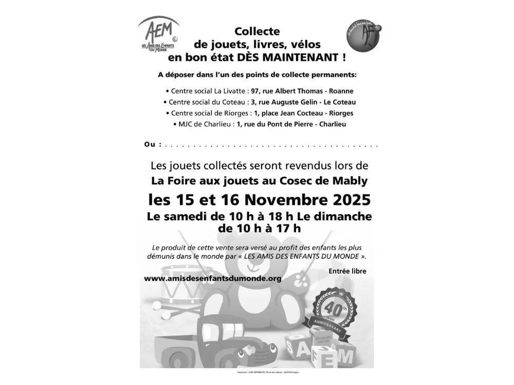 Samedi 15 et dimanche 16 novembre 2025, participez à la 40ème Foire aux jouets organisée par les "les Amis de la foire aux jouets", à la salle du Cosec à Mably.