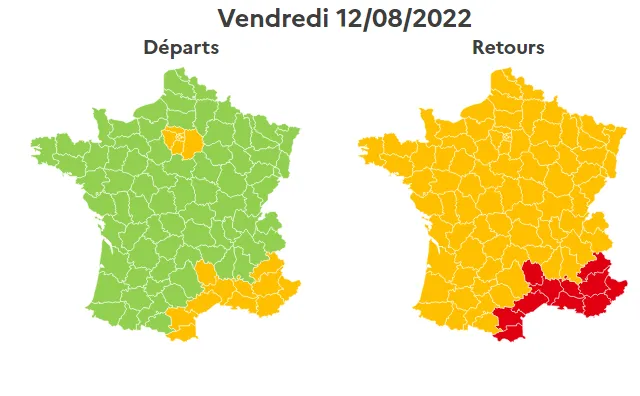 Dans le sens des départs, la journée est classée verte sauf sur le sud-est et l'Ile-de-France qui sont en orange.