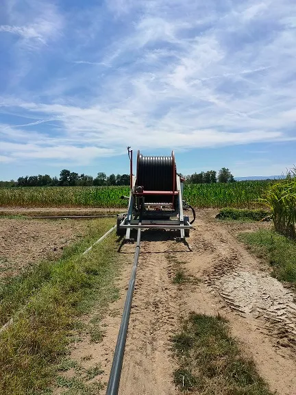 Les feuilles des maïs sont défraichies, jaunies par un soleil de plomb. Mais c’est surtout l’absence d’irrigation qui les fait mourir. Le puit pompe l’eau dans les nappes phréatiques avant de l’envoyer jusqu’à l’arroseur. D’habitude, les maïs sont irrigués « 22h à 24h par jour » à raison d’environ 25 000 litres d’eau par heure (un français consomme 53 000 litres d’eau par an environ).