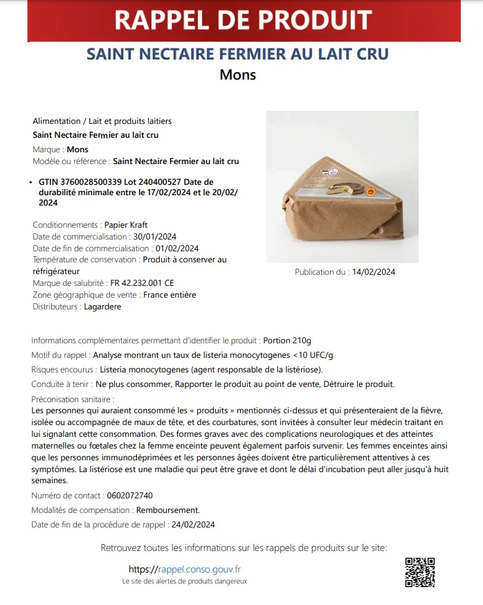 Les personnes, ayant consommé les lots de Saint-Nectaire concernés, peuvent présenter de la fièvre, des courbatures ou encore des maux de tête. Dans ce cas, il est conseillé de vous rendre chez le médecin. Le délai d'incubation va jusqu'à huit semaines.