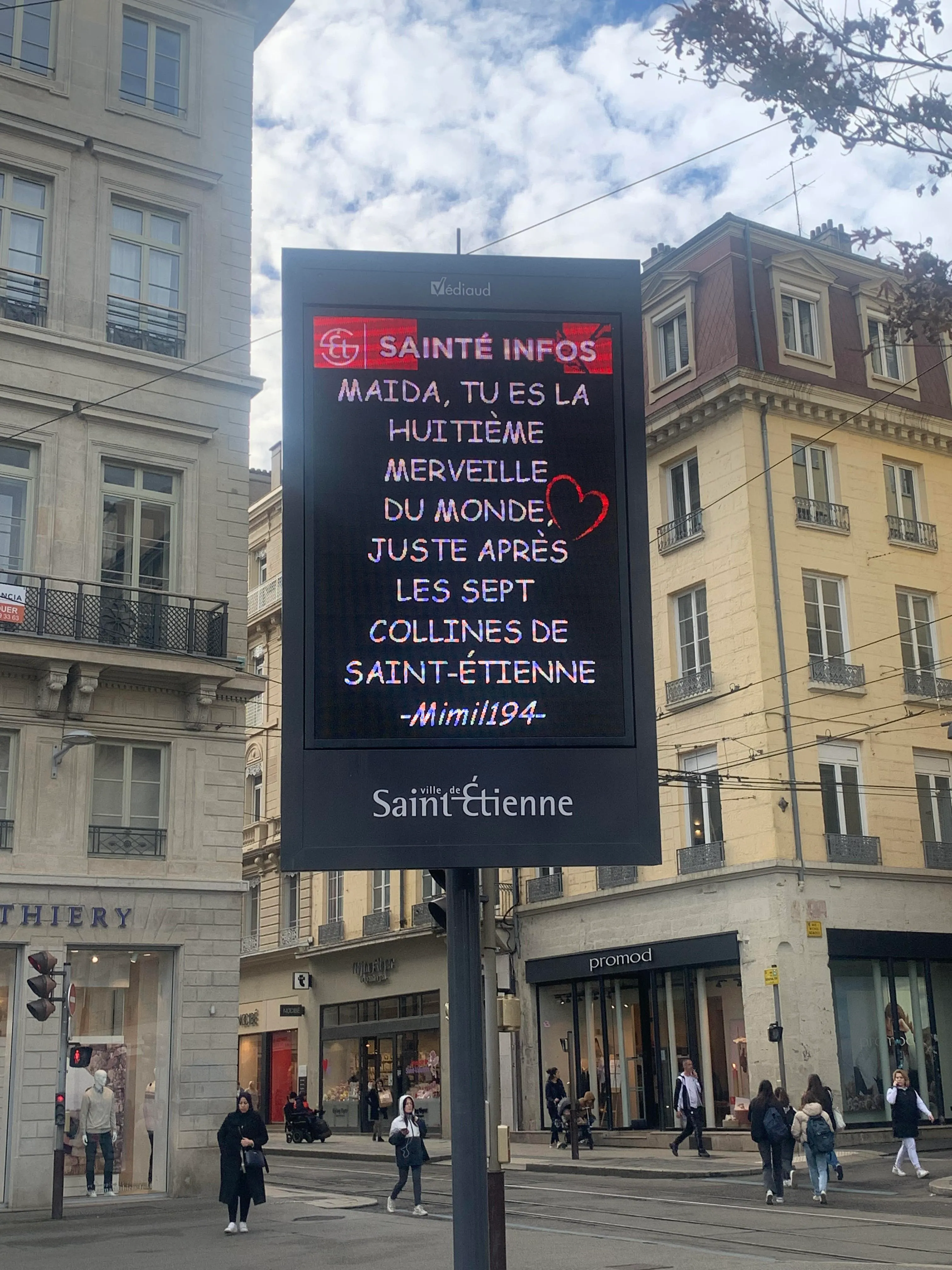 "Tu es la huitième merveille du monde, juste après les sept collines de Saint-Etienne", "Tu es l'étoile sur mon maillot, à jamais la première dans mon coeur" voilà quelques uns des messages que vous pouvez lire ce mercredi dans les rues de Saint-Etienne sur les panneaux de la ville.