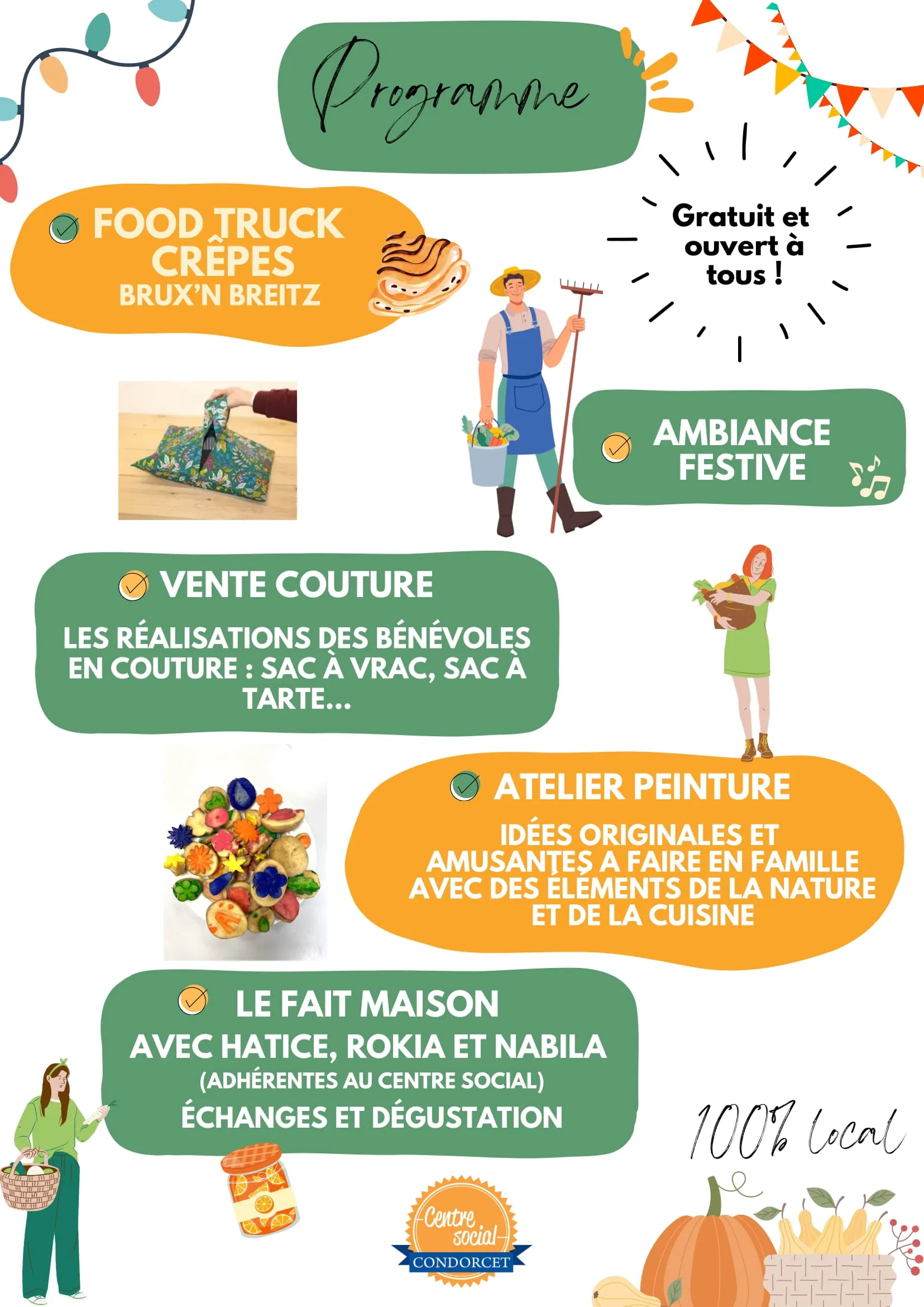De nombreuses animations viendront rythmer le marché : food truck crêpes, atelier peinture, couture, et venez échanger sur le fait maison avec des adhérents du centre social.